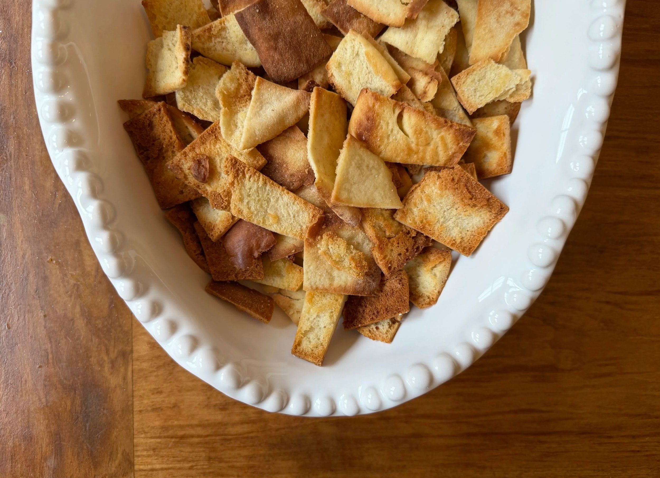 Preheat your oven to 350 degrees (either conventional bake or air-fry, if that's a setting you have).Line your largest baking sheet with parchment or silicone baking mat (you may need more than one sheet, depending on how many pita chips you’re making).Slice each pita in half to divide it into two flat disks. If that is too tedious, simply cut off the edges. Next, cut each disk into quarters or bit size pieces to your liking.Toss the pieces lightly with olive oil, either in a bowl or right on the lined baking sheet. Scattered the pita pieces evenly onto the baking sheet(s), one layer, avoid overlapping pieces, and sprinkle them lightly with salt.Bake them for 7 or 8 minutes, until toasted. Cool, then store in a tightly tied plastic bag until you are ready to use them.